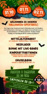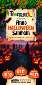 ANNO Halloween Samhain öffnet seine Tore in der idyllischen Umgebung des Tierparks Nadermann. Mit einem abwechslungsreichen Programm und einer beeindruckenden Kulisse verspricht das mittelalterliche Fest ein unvergessliches Erlebnis zu werden. ANNO Halloween Samhain ist mehr als nur eine Hommage an alte, keltische Bräuche. Es verbindet die mystische Atmosphäre von Halloween mit der Authentizität eines mittelalterlichen Marktes. Was erwartet die Besucher? Musik aus alten Zeiten, Gaukeley und Theater sowie gruselige Höhepunkte wie z. B. der Geisterzug, das Gespensterhaus oder die abendliche Feuershow. Marktgeschehen und Heerlager. Unterhaltung für große und kleine Menschenkinder. Eine faszinierende Reise in die Vergangenheit, um in die Magie von Samhain einzutauchen. Die Kombination aus Geschichte, Unterhaltung und Grusel macht dieses Fest zu einem echten Höhepunkt in jedem Veranstaltungskalender.